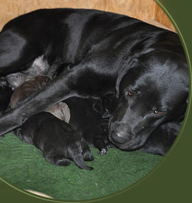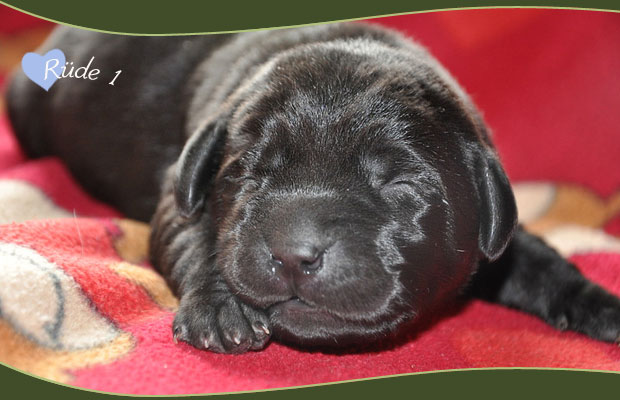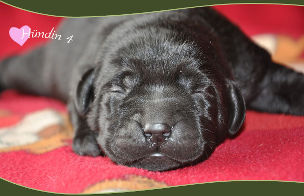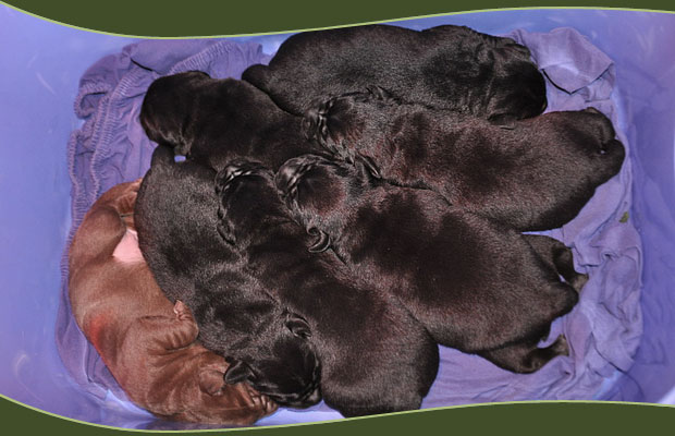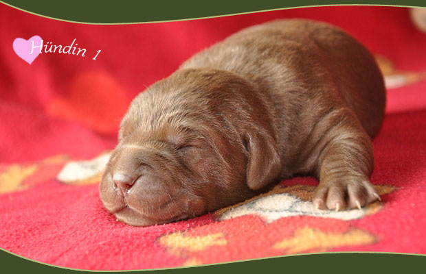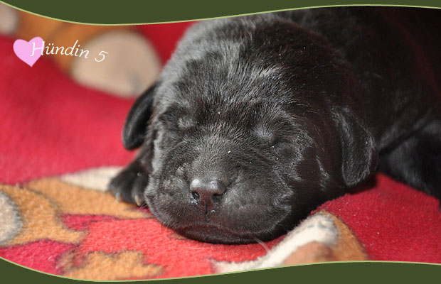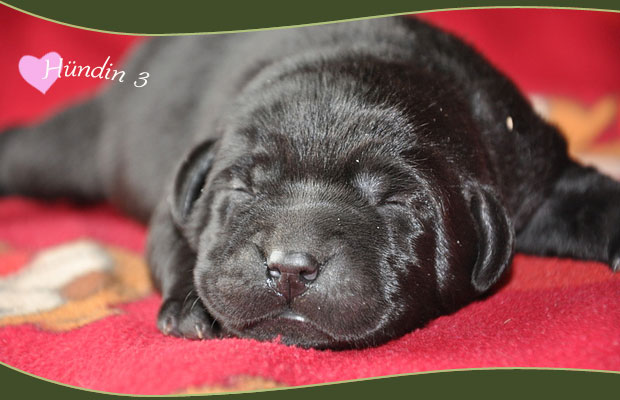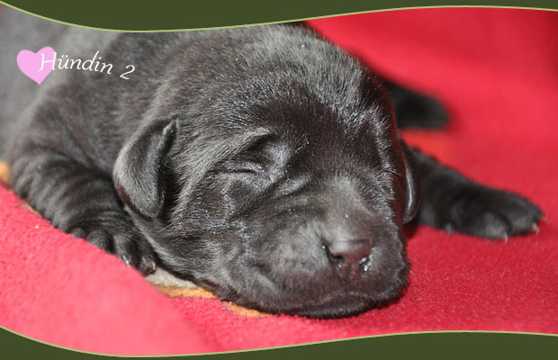 14. April: Josies Welpen kriechen noch blind und taup durch die Wurfbox. Josie verteidigt ihre Welpen nicht mehr ganz so wehement. Bente durfte heute sogar schon einen Blick zu den Kleinen wagen. Die Mäuse haben alle die 1kg-Marke geknackt und entwickeln sich ganz nach unseren Vorstellungen.
