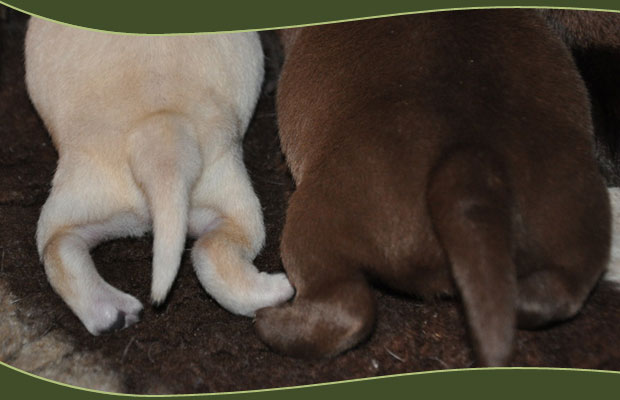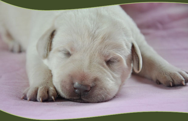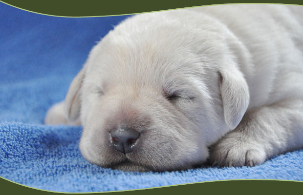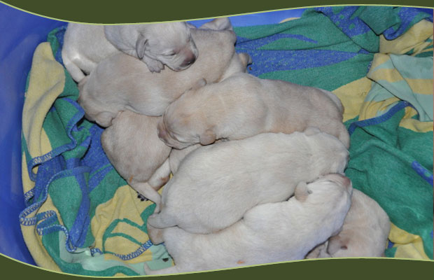 Die Welpen auf der rosa Decke sind die Hündinnen und die auf der Blauen die Rüden.